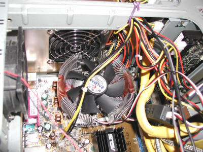 | Le ventilateur de CPU Zalman. Ouf ! Il arrive à quelques millimètres de la grille inférieure de l'alimentation. Il est énorme, mais c'est ce qui lui permet de tourner lentement. J'ai utilisé de la pâte thermique Artic Silver 3 pour optimiser la dissipation de chaleur.