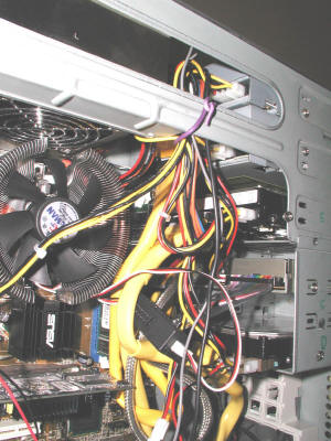 | Les nappes rondes, c'est encore assez touffu, mais ce n'est rien par rapport aux nappes plates. Le boîtier de commande du ventilateur de CPU est coincé dans une des boucles. |