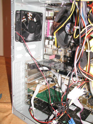 | Le ventilateur arrière alimenté en 5 V. Il permet à l'alimentation de ne pas évacuer tout l'air chaud, et donc aux ventilateurs Papst de rester dans des régimes moteur silencieux.