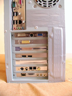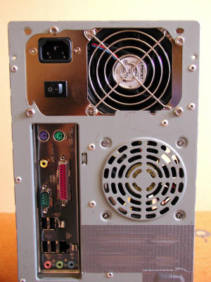| Voici donc l'arrière de la tour. J'ai obstrué les entrées d'air trop proches des deux ventilateurs avec du ruban adhésif solide et épais. L'alimentation Q Technology n'est pas donnée, mais le silence est d'or dans un studio ! |
