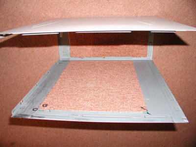 | L'intérieur du boîtier est doublé de moquette, la même qui a servi pour le sol de mon studio ! Ces dalles sont constituées d'un support en plastique mou et dense qui absorbe les vibrations doublé de la moquette elle-même qui absorbe les ondes sonores aériennes. |
