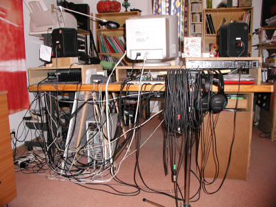 | Voici la nouvelle config de mon ordinateur de studio. Grâce à lui, je peux en même temps travailler sur World ou Frontpage, surfer sur Internet tout en écoutant de la musique avec le lecteur Creative Audigy, en numérisant un film de mon caméscope numérique par le port Firewire, ... Ceci sans aucun plantage ni ralentissements dans les applications. En ce qui concerne l'audio multipistes, "c'est trop facile" pour lui. Le ventilo ne souffle -modérément- que lors de l'encodage des films. Il est constitué d'éléments que j'ai choisi avec soin et assemblés : - Un boîtier Morex qui date mais qui est très solide et surtout de hauteur moyenne, donc peu encombrant. - une carte mère ASUS P4P800 - un Pentium 4 2.8C boosté à 3 GHz - 1 Go de mémoire RAM noname chips Samsung - 2 disques durs Hitachi 120 Go UDMA 100 8 Mo cache 7200 rpm + 1 Hitachi SATA 250 Go 7200 rpm - un graveur de DVD Sony DRU 510A - un lecteur de DVD Creative 12 X (ancien mais fiable) - un lecteur de disquette - une carte vidéo HIS ATI Radeon 9200 SE 128 Mo - un ventilateur Zalman CNPS7000A AlCu - une alimentation Q-Technology 350 w PFC avec 2 ventilateurs PAPST - deux ventilateurs 80 mm de récupération branchés en 5V - des nappes rondes : 2 IDE et 1 lecteur de disquettes - carte son Frontier Wave Center PCI ADAT et S/Pdif - carte son Creative Audigy 2 ZS Platinium Pro qui comporte 2 ports Firewire, 2 E/S midi, 4 S/Pdif, casque, etc... - de l'isolant phonique Nomaphone (www.nmcdiy.com) - des dalles de moquette de bonne qualité. J'ai acheté l'ensemble du matériel informatique chez LDLC |