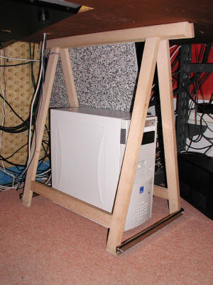 | Voici le boîtier installé à sa place, sous un solide tréteau en hêtre. A droite, une épaisse planche doublée d'isolant phonique atténue encore le bruit résiduel de sortie des ventilateurs. |